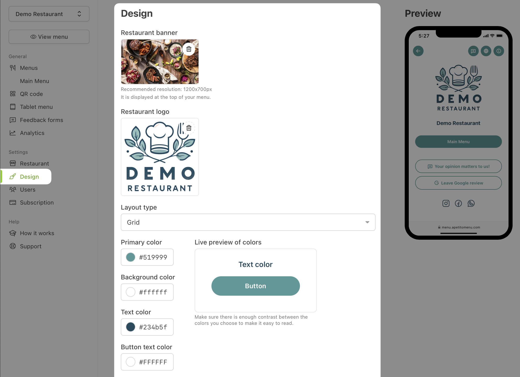 To customize the design of your menu, go to "Design" page. You can upload logo and banner, choose layout, customize colors to match your brand, upload custom fonts, configure welcome and home pages.