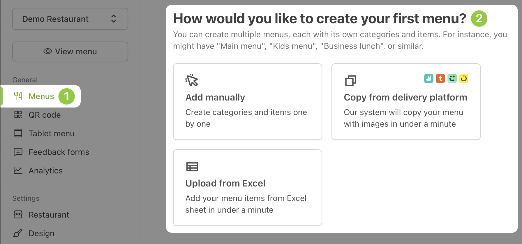 Go to "Menus" page, and create your first menu (you can add more menus anytime later) using one of available options: