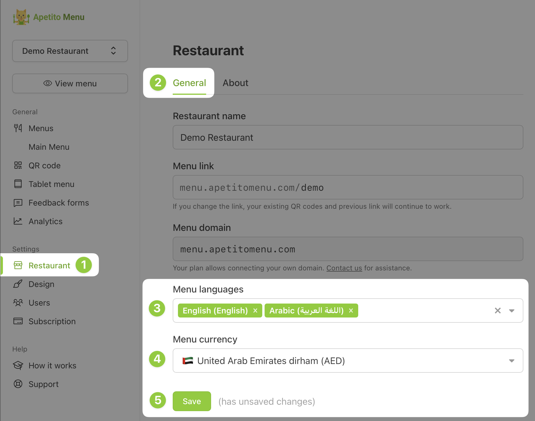 If you want to change menu languages and currency, go to "Restaurant" → "General".